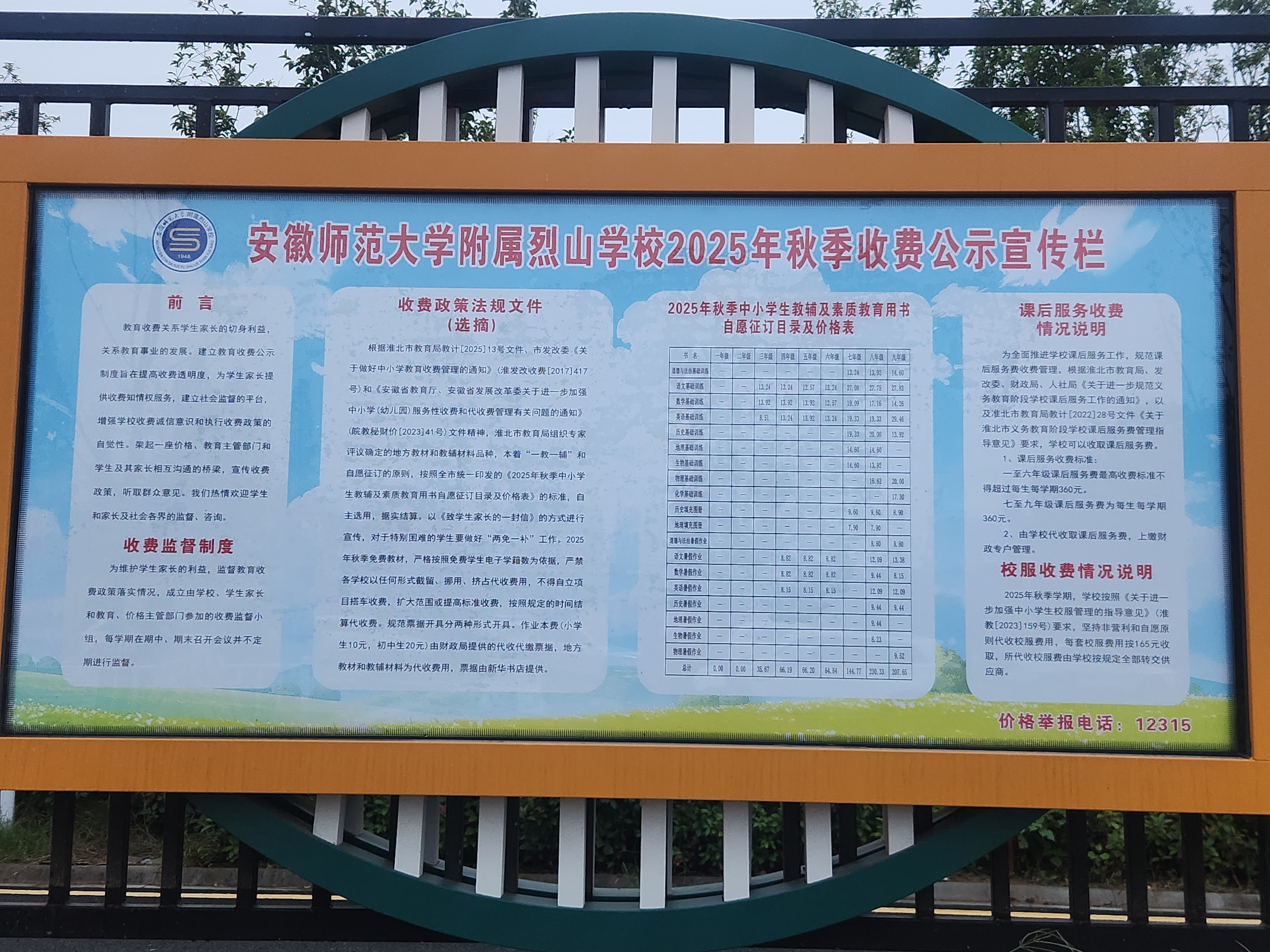 安徽师范大学附属烈山学校2025年秋季收费公示